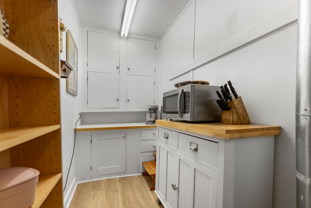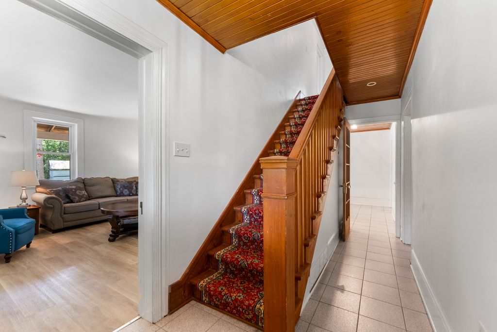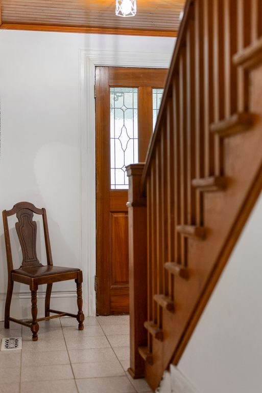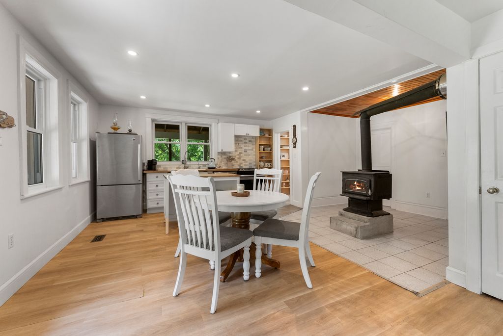 Step inside to be greeted by a stately staircase and a warm, inviting layout. To the left, the cozy living room flows into a bright kitchen with a wood stove, ideal for added comfort on cooler days. The main floor also features a spacious bedroom, a 3-piece bath, convenient laundry area, and two walk-in pantries for all your storage needs.